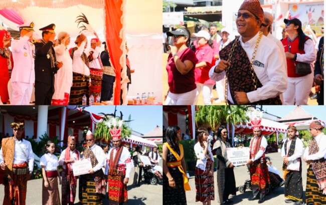 Gubernur Melki tampak mengenakan pakaian adat Ende bersama Ibu Mindriyati Astiningsih, sementara Wakil Gubernur Johni Asadoma dan Ibu Vera Sirait mengenakan pakaian adat Alor.