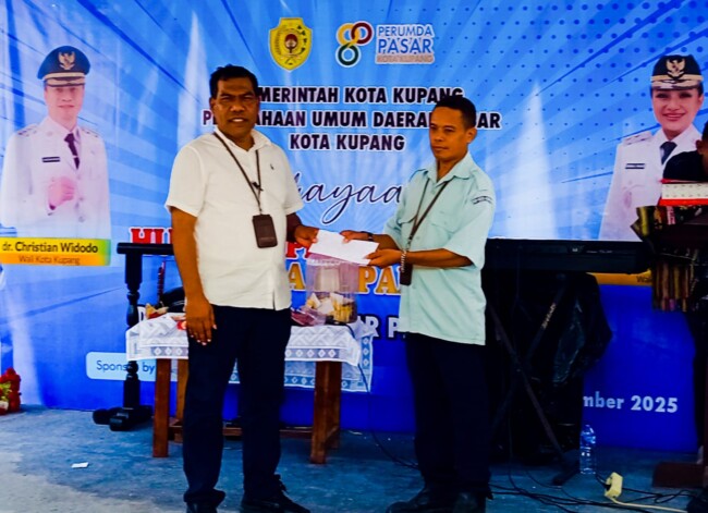Maxi Nomlene,.SH., MH – Direktur Pemasaran Perumda Pasar Kota Kupang saat menyerahkan hadiah kepada Jems Ndoen karyawan teladan Perumda Pasar Kota Kupang