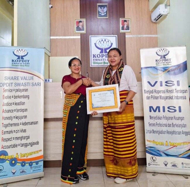 LABUAN BAJO | BuletinNTT.com – General Manager Kopdit Swasti Sari, Imelda Anin, menyerahkan penghargaan kepada Maria Ivona Agur, anggota aktif Kopdit Swasti Sari Cabang Manggarai Barat, sebagai anggota TWTJ (Tepat Waktu Tepat Jumlah).