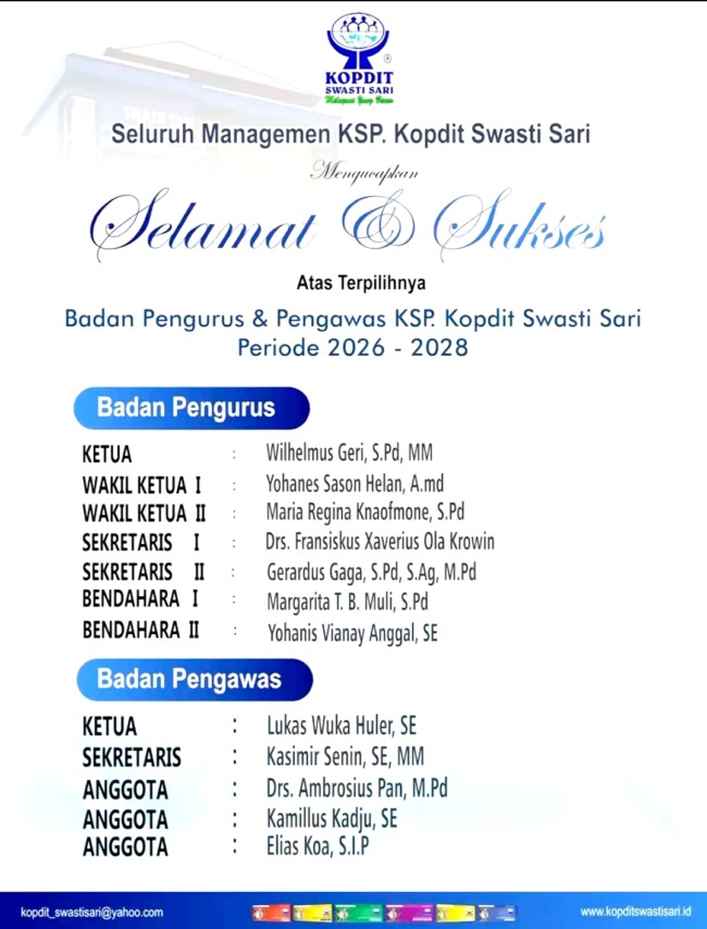 Berdasarkan pengumuman resmi, susunan Badan Pengurus Kopdit Swasti Sari periode 2026–2028 adalah sebagai berikut: