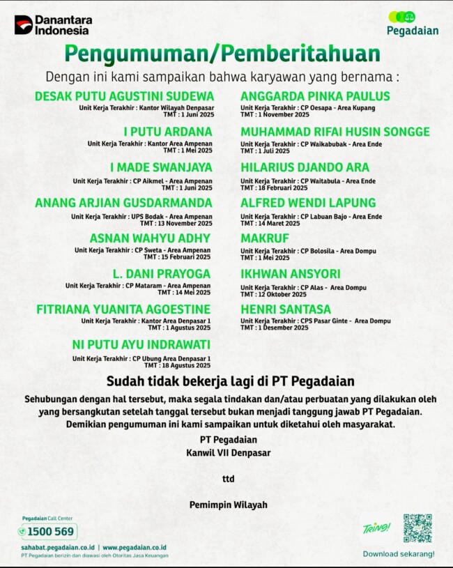 Beranda Ekonomi PT Pegadaian Kanwil Denpasar Sampaikan Pemberitahuan Resmi kepada Masyarakat EkonomiPT Pegadaian Kanwil Denpasar Sampaikan Pemberitahuan Resmi kepada MasyarakatBuletinNTT.ComTim Redaksi 26 Februari 2026 : 14:49 WITA×PT Pegadaian Kanwil Denpasar Sampaikan Pemberitahuan Resmi kepada MasyarakatSebarkan artikel ini Reporter: Ben | Editor: Redaksi Baca Juga : Anggota Swasti Sari Sudah Terlindungi BPJS Kesehatan | Bupati SBD Dorong Masuk BPJS Ketenagakerjaan Pos TerkaitEkonomiLambert Ara Tukan, Luruskan Mekanisme Penentuan Struktur Pengurus – Pengawas Kopdit Swasti SariEkonomiWilhelmus Geri Nahkodai Kopdit Swasti Sari, Tekankan Disiplin dan Semangat KekeluargaanEkonomiPengurus dan Pengawas Kopdit Swasti Sari Periode 2026–2028 Resmi Terpilih, Ini SusunannyaEkonomiKopdit Solidaritas Sta. Maria Asumpta Serahkan Santunan Duka | Sisa Pinjaman DiputihkanEkonomiDari Duka Menjadi Harapan | Santunan Obor Mas Ringankan Beban KeluargaEkonomiNama Pengurus dan Pengawas Sementara Kopdit Swasti Sari | Ketua Ditentukan Melalui Voting Internal