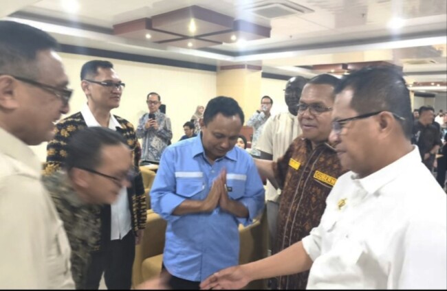 Gubernur NTT, Emanuel Melkiades Laka Lena, tampak berbincang santai dengan Tenaga Ahli Kementerian Koordinator Bidang Pangan RI, Simon Petrus Kamlasi (SPK), dalam Lokakarya Persiapan Penguatan Program Pendidikan dan Gizi serta Koordinasi Penyelenggaraan Rantai Pasok Bahan Baku Pangan.